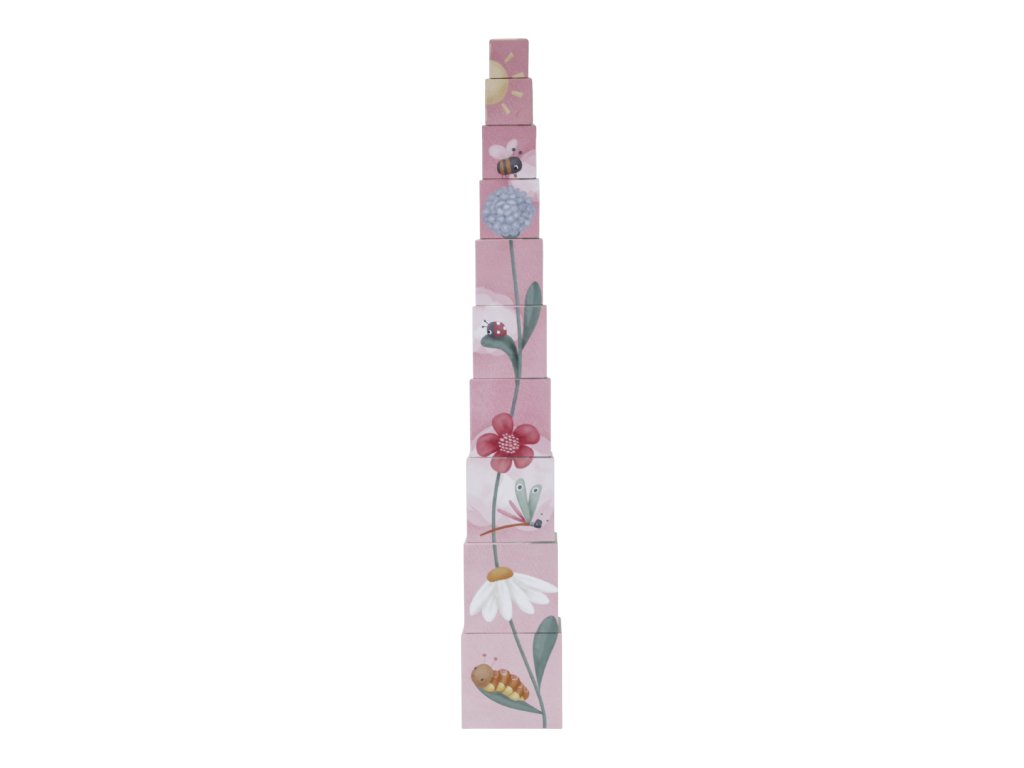 Barevné kartonové kostky s krásnými ilustracemi ze života na louce. Nechte vaše dítě kostky skládat na sebe do vysoké věže nebo vedle sebe podle velikosti. Ve starším věku se dítě s pomocí očíslovaných kostek může hravým způsobem učit počítat i rozpoznávat číslice. Kostky jsou součástí designové kolekce hraček Little Dutch Květiny a motýli. Nejmenší kostka má 5 cm a největší má 14 cm. Po skončení hraní kostky snadno uložíte složením do sebe. Vhodné pro děti od 18 měsíců.